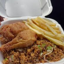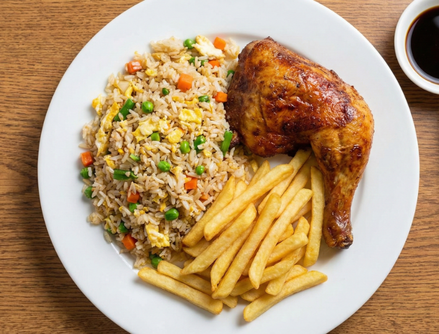 Delicioso arroz frito mezclado con trozos de pollo, cerdo, jamón + papa francesa + 8 alas