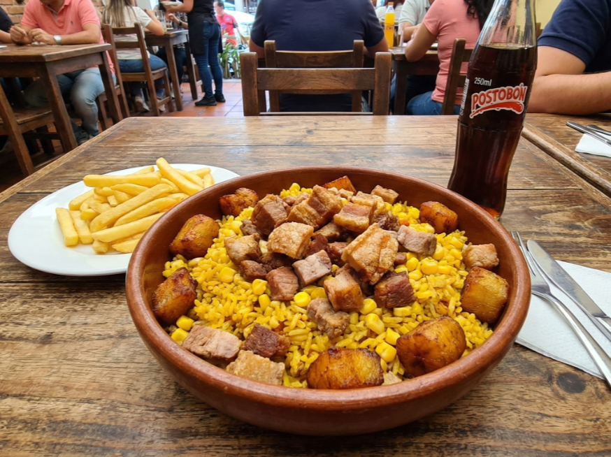 Porción de arroz Paisa (delicioso Arroz con trozos de plátano maduro+ trozos de pollo + trozos cerdo, maicitos + vegetales salteados)+ papas francesas + 1 gaseosa 250 ml postobon