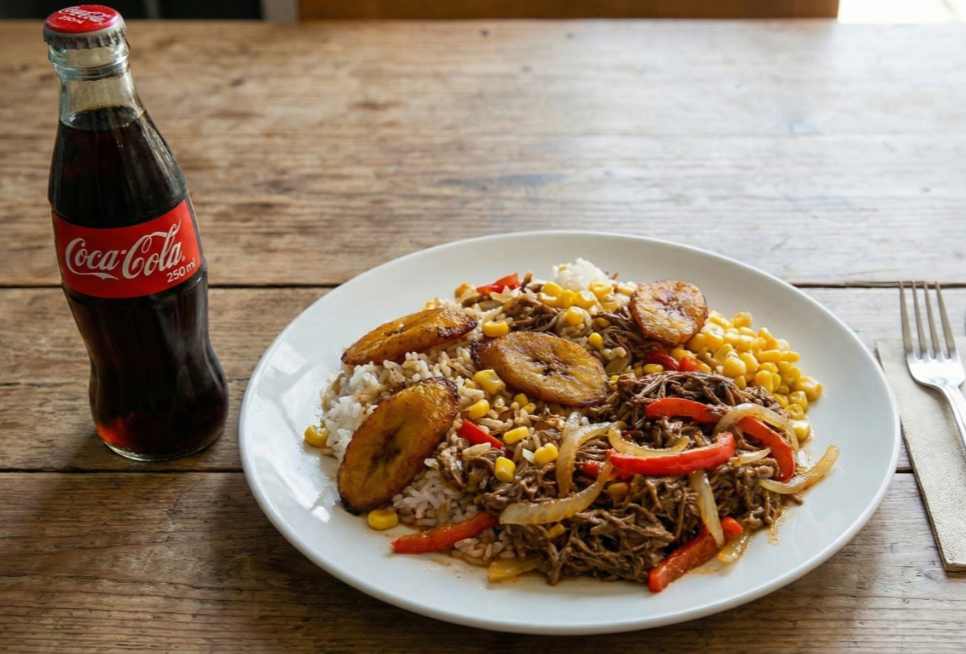 Porción de arroz paisa para 2 personas (delicioso Arroz con trozos de platano maduro+ trozos de pollo + trozos cerdo,maicitos, vegetales salteados) más papas francesas más 1 Coca Cola 250 ml.250 ml.