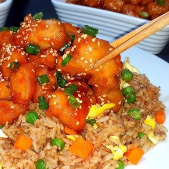 Porciones de arroz Para 2 personas más pollo agridulce + papa francesa + 1 gaseosas 250 ml postobon