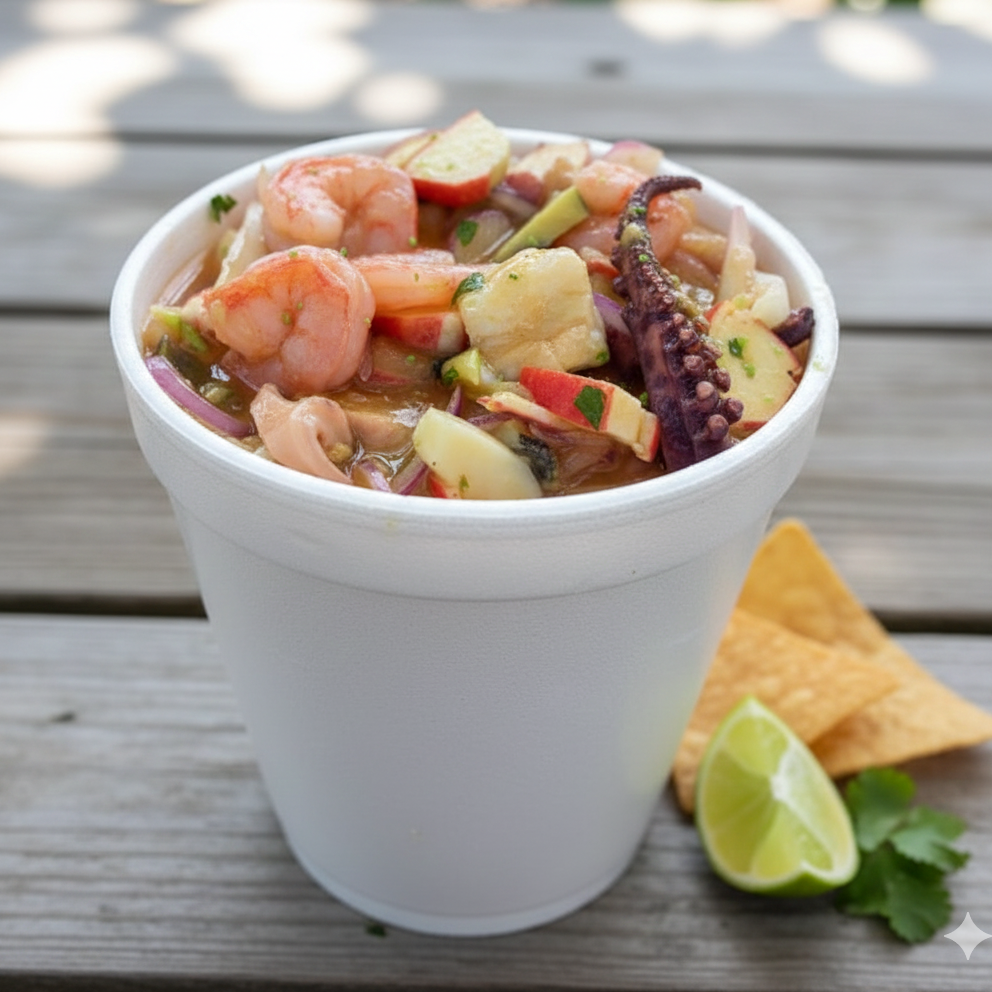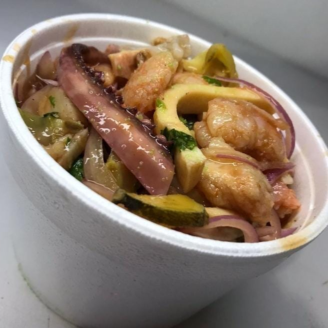Base de salsa rosada con pescado, pulpo, calamar, camarón, caracol, palmito de cangrejo, mejillones, almejas, aguacate, cebolla, cilantro y ají dulce.
