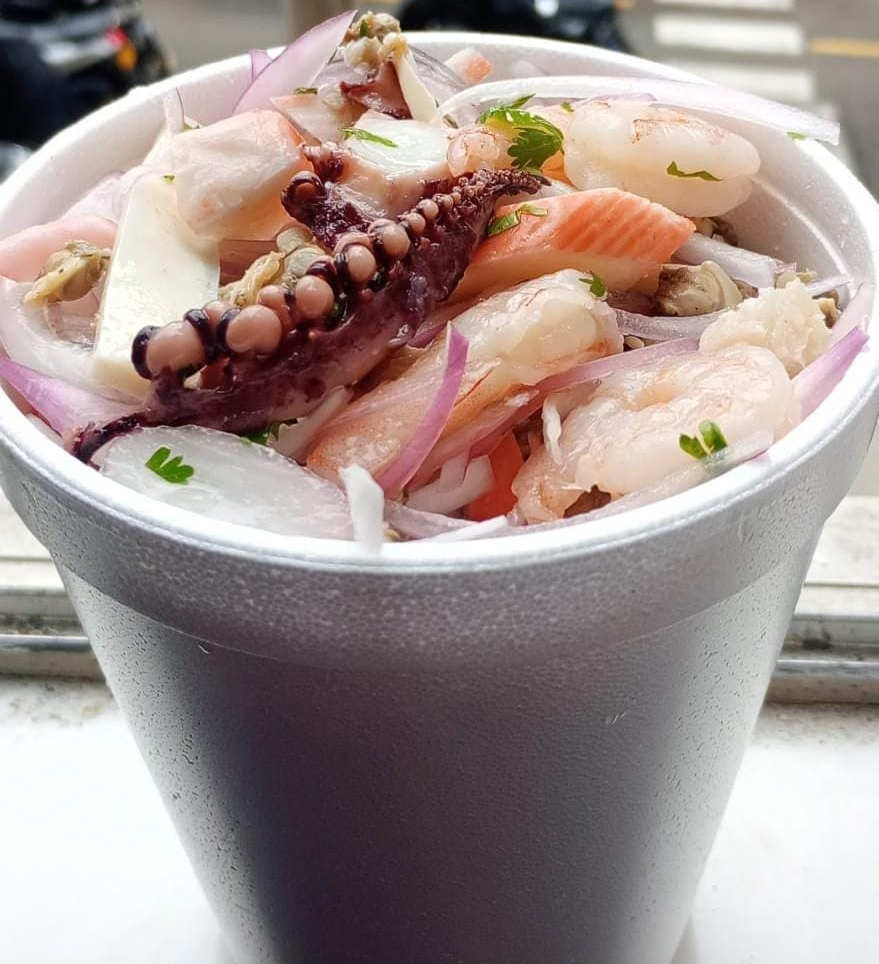 Con una base de salsa picante, incluye pescado, pulpo, calamar, caracol, camarón, palmito de cangrejo, mejillones, almejas, cebolla, cilantro y ají dulce.
