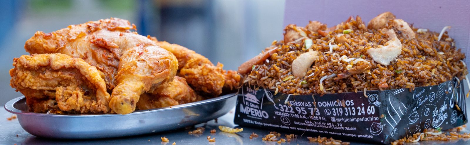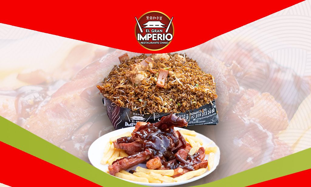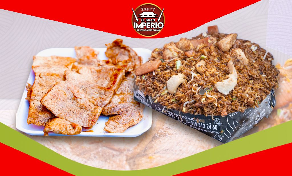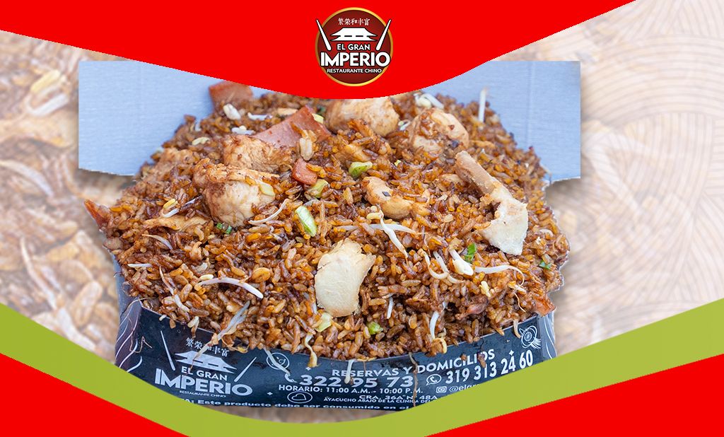 Disfruta de nuestro arroz chino, con un toque único de vino y salsa de soya. Sabrosos trozos de carne de cerdo, jamón, pollo, raíces chinas y cebollas frescas se combinan para