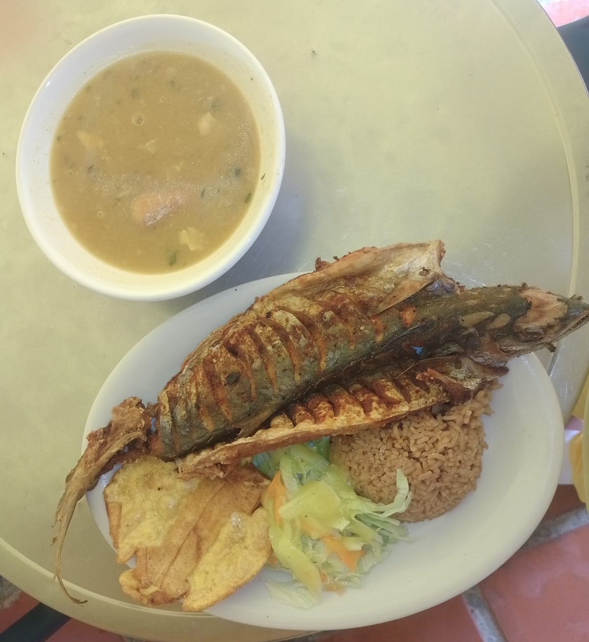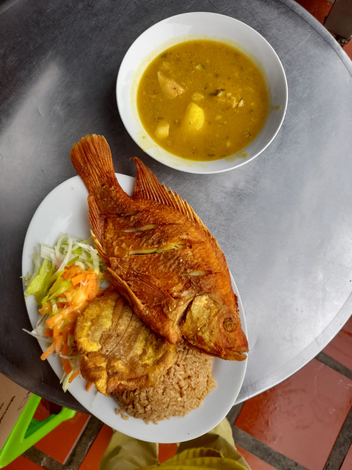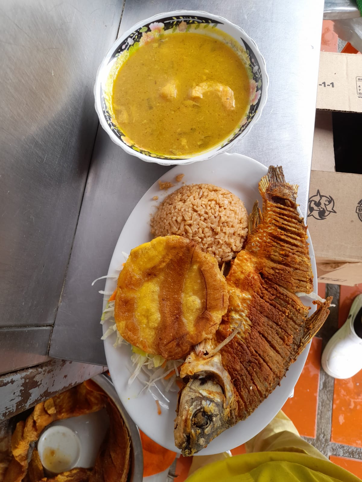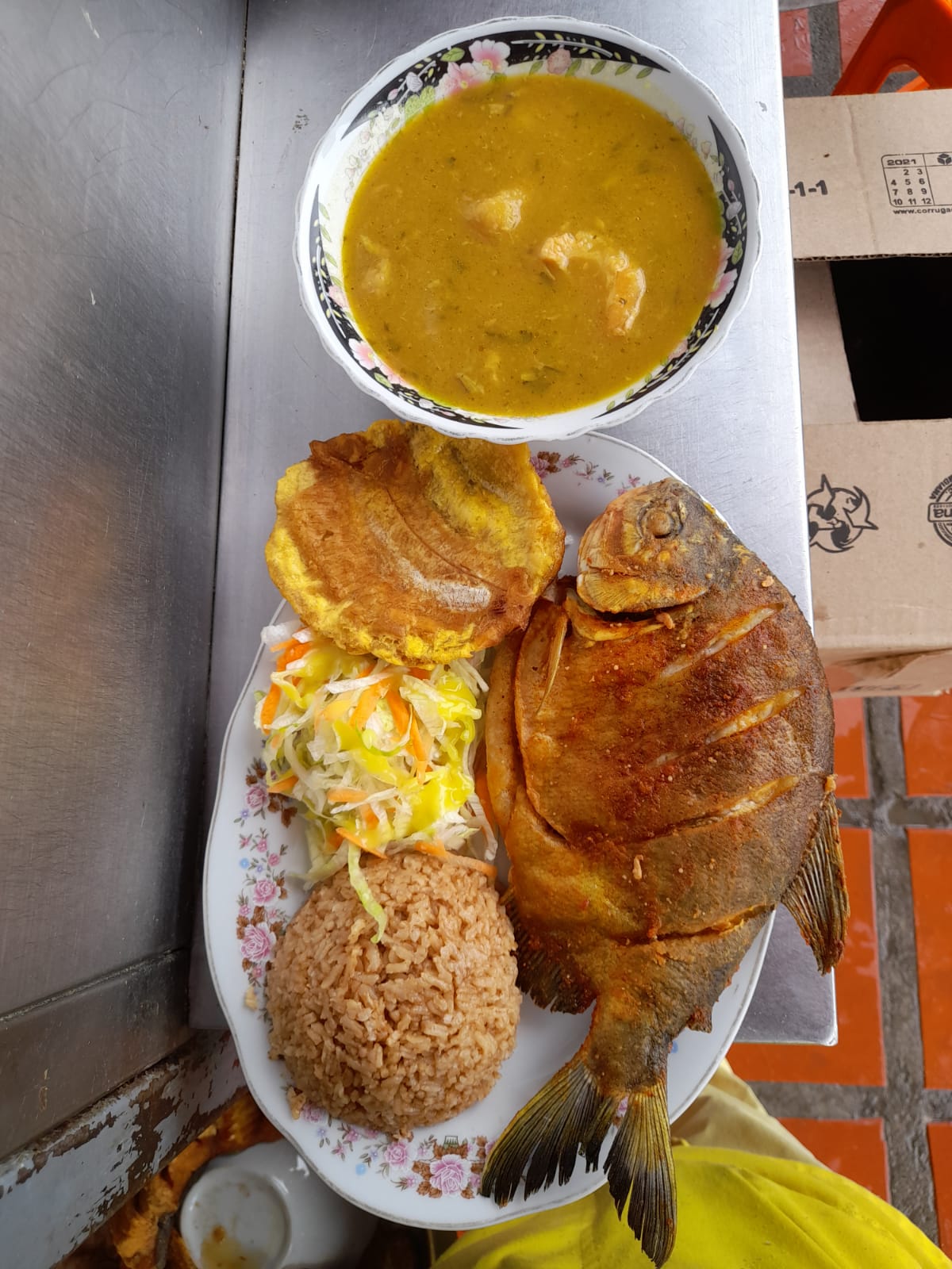 Acompañado de arroz con coco o blanco, patacón, ensalada y consome de pescado