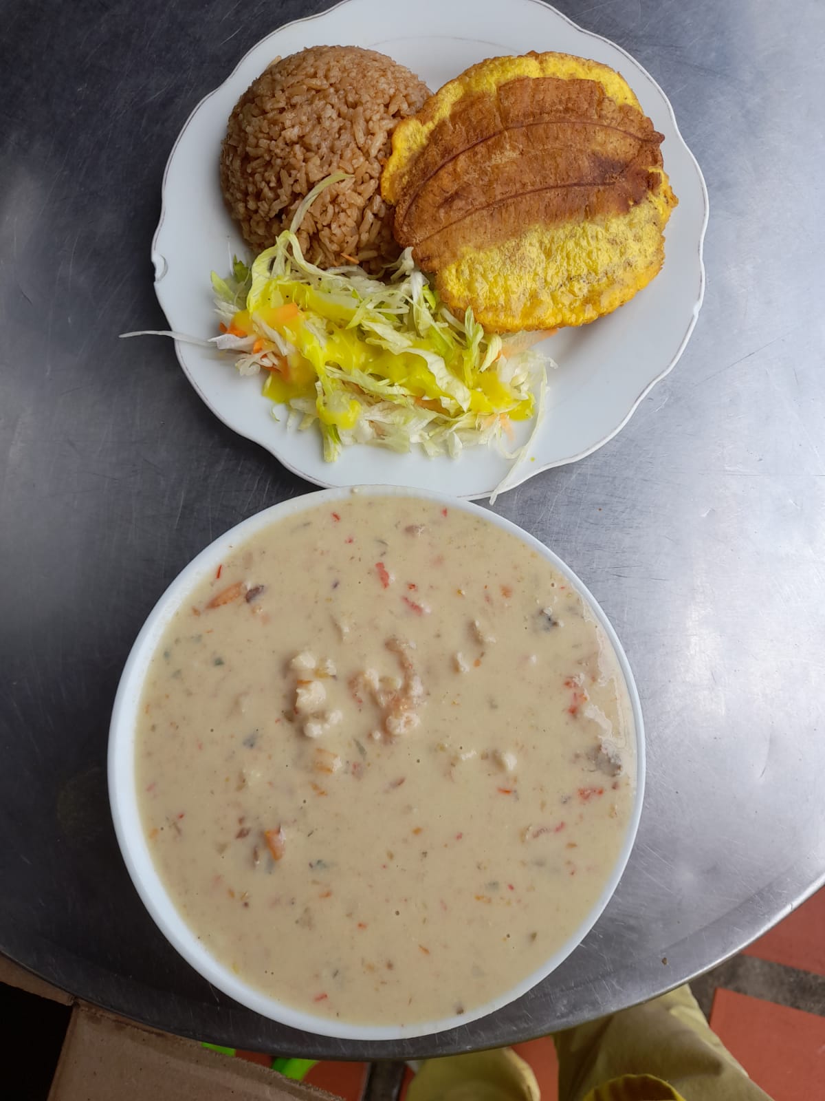 Delicioso bragre de mar sudado , con arroz ,patacon, ensalada, y consome de pescado