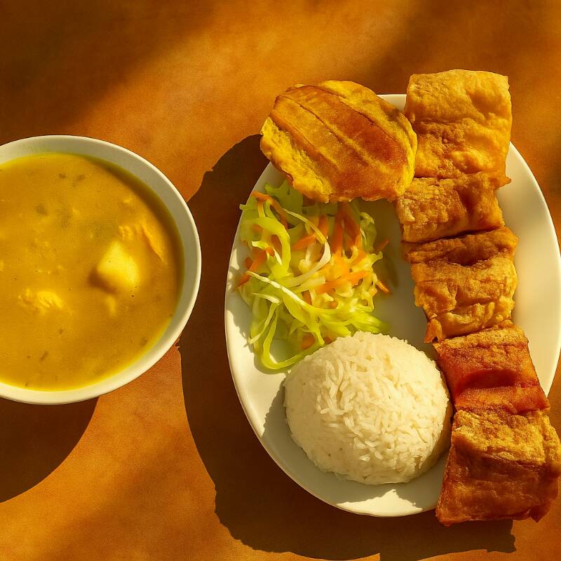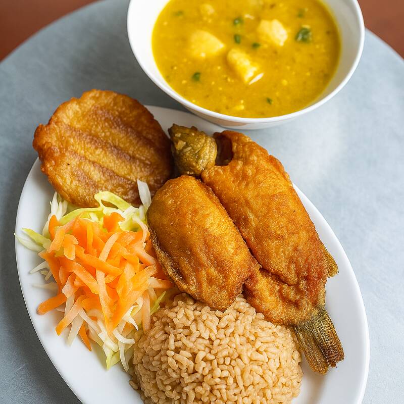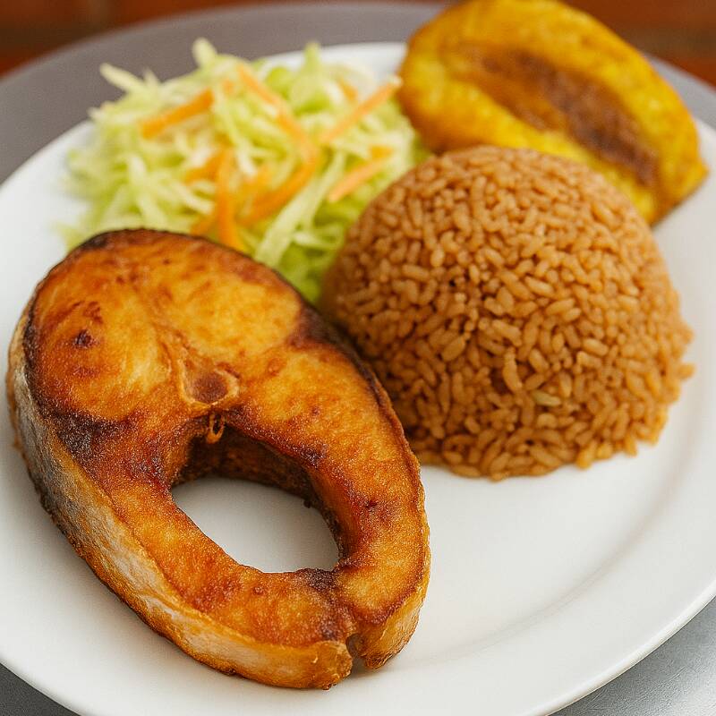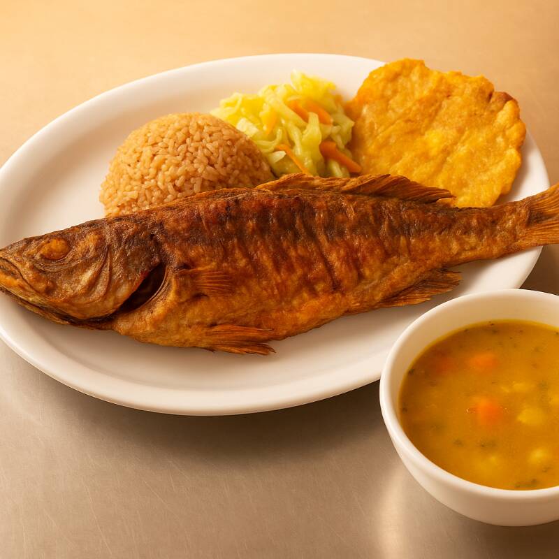 Acompañado de arroz con coco o blanco, patacón, ensalada y sopa.