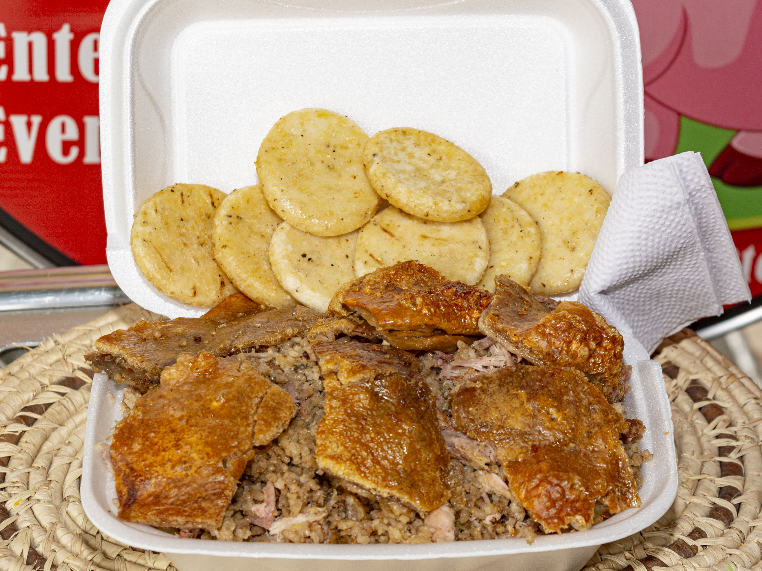 (para 1 o 2 personas)Lechona preparado con carne de cerdo, arroz, arveja y piel de cerdo crocante.