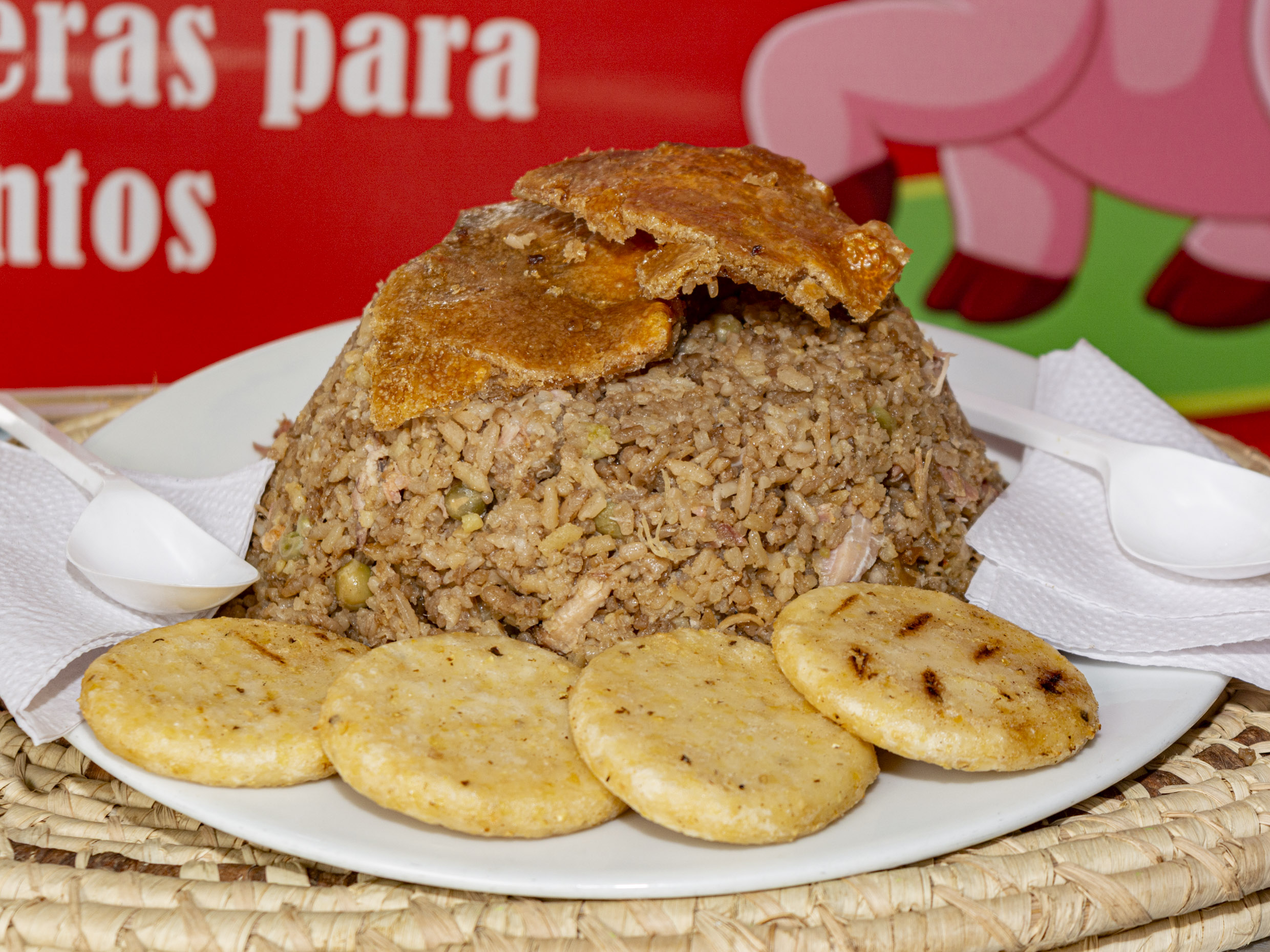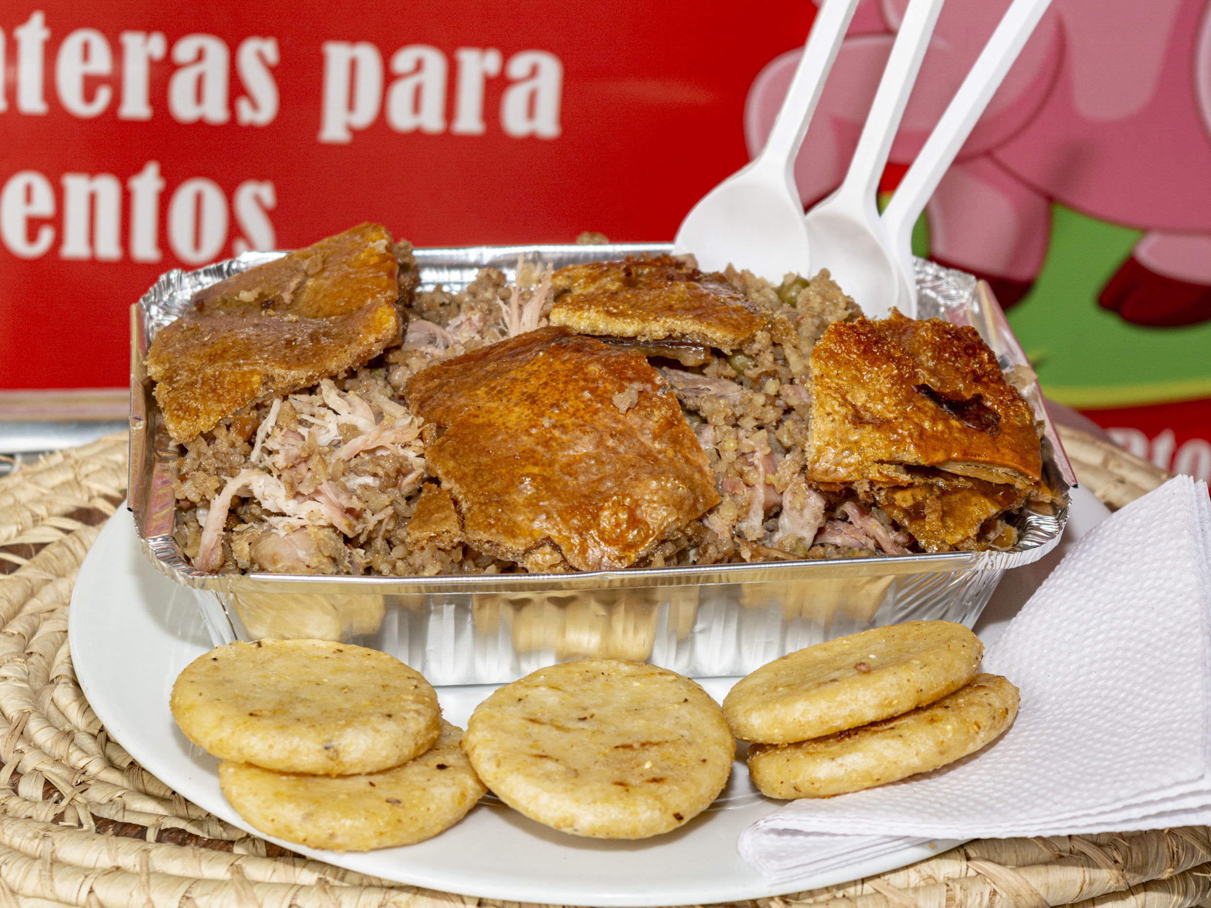 (para 3 personas)Lechona preparado con carne de cerdo, arroz, arveja y piel de cerdo crocante..