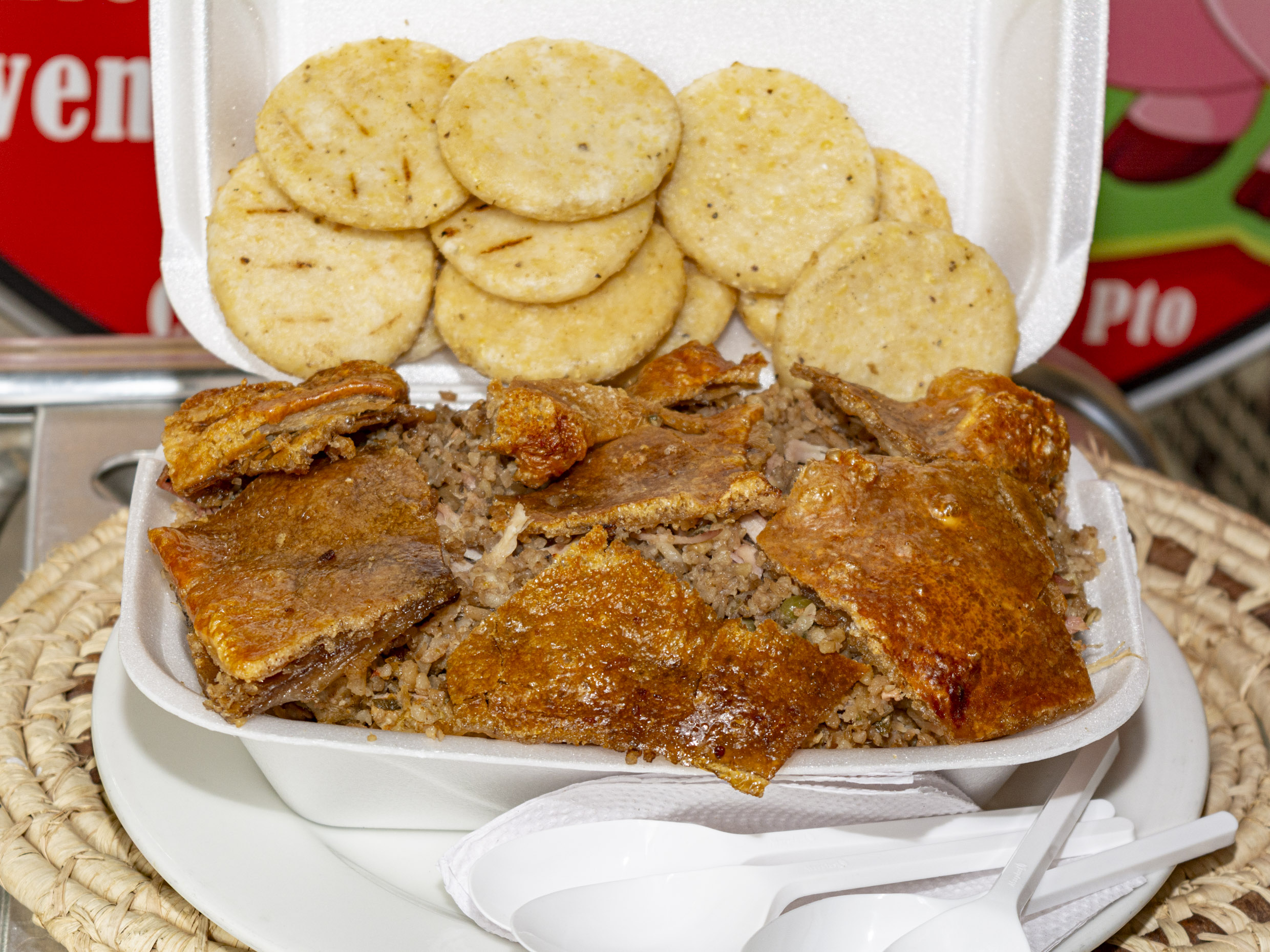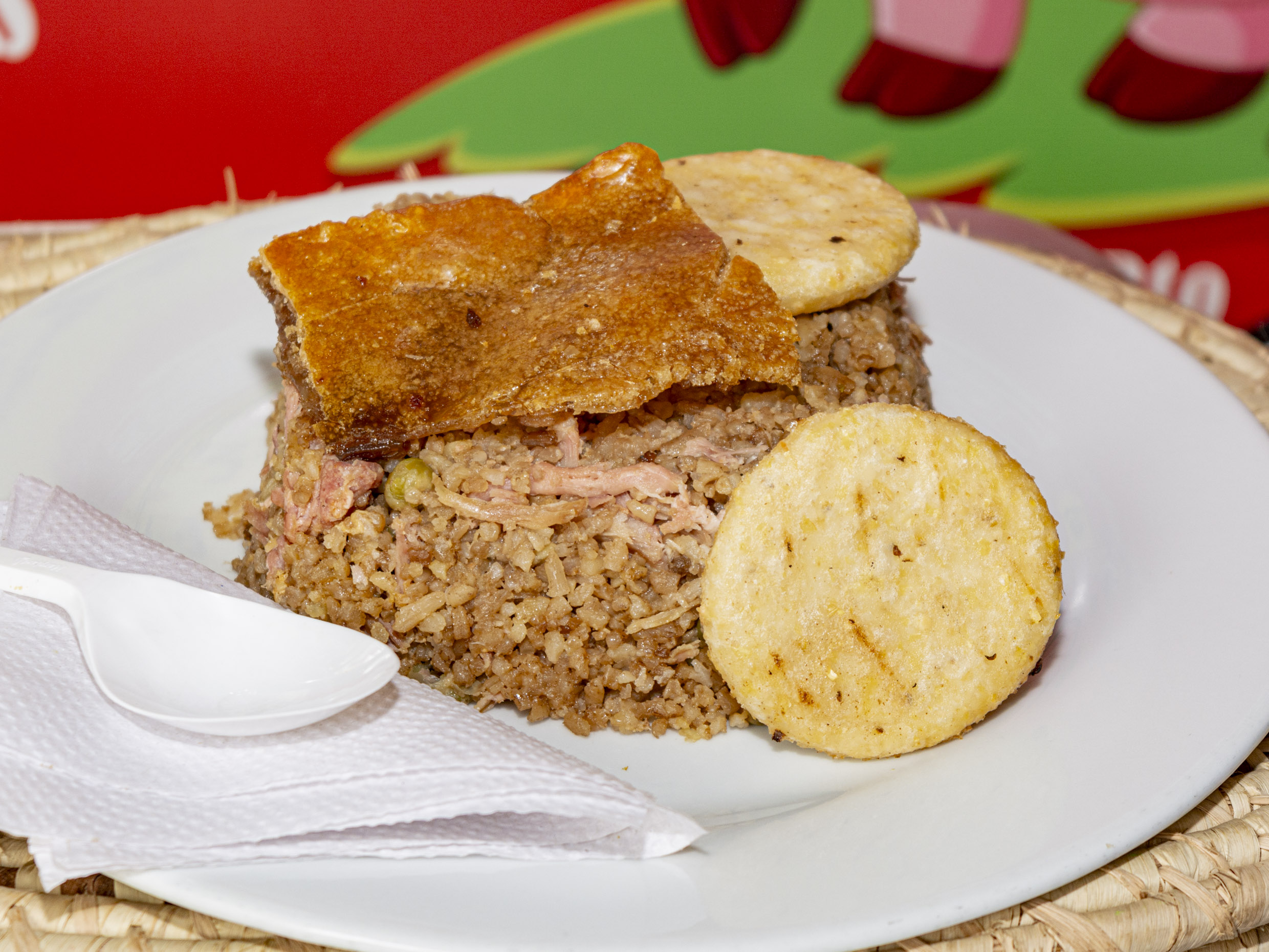 (para 1 persona)Lechona preparado con carne de cerdo, arroz, arveja y piel de cerdo crocante.