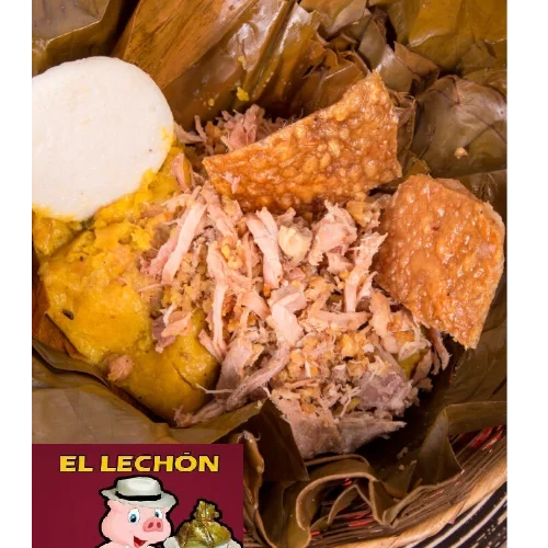 tamal tolimense con lechona cuero crujiente y arepa