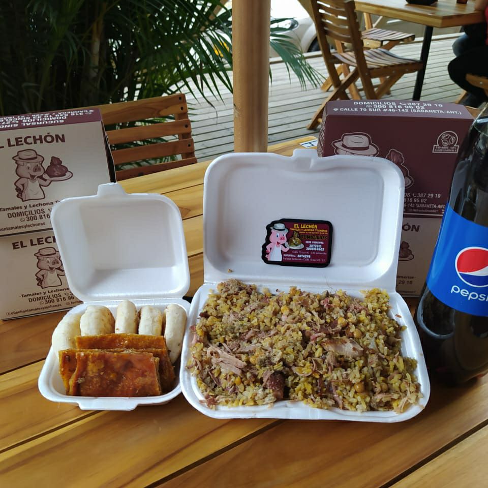 Lechona tolimense 500gr acompañada de arepa y cuero crujiente, más gaseosa 250 ml (el sabor de la gaseosa varia según disponibilidad)