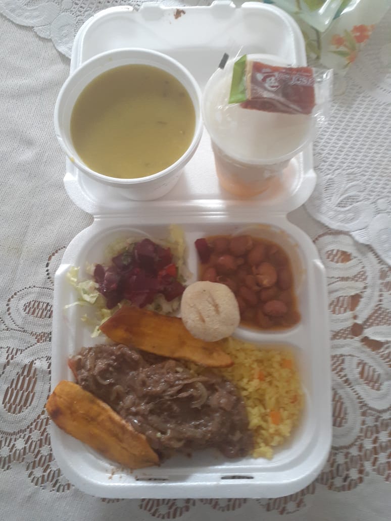 Arroz, frijoles, ensalada, tajada de maduro, arepa, carne, sopa del día y sobre mesa.