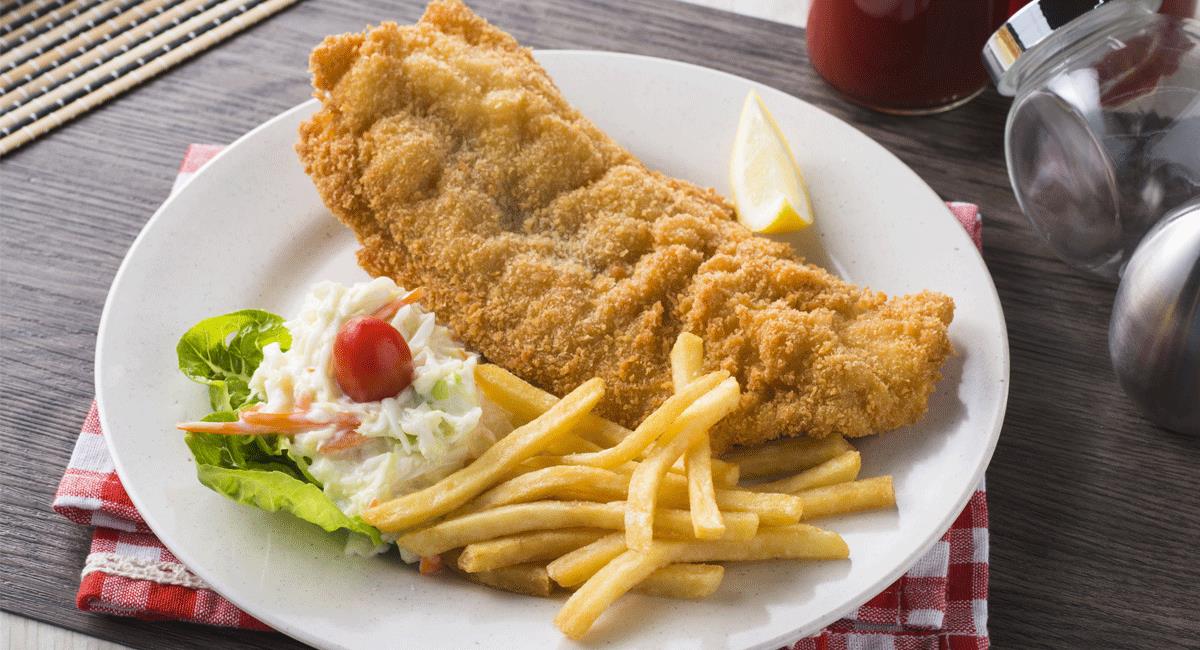 Una Rojadas de Bagre, Arroz , Ensalada, papas ala francesa, sopa del dia y jugo del dia