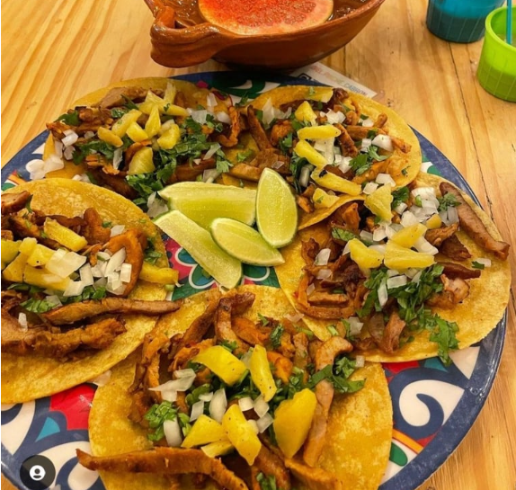 Orden de 2 volcanes, de carne al pastor, cochinita pibil o suadero, 2 tortillas de maíz crujientes con queso, la carne elegida, más queso derretido encima y más carne, acompañado de cebolla, cilantro y piña.