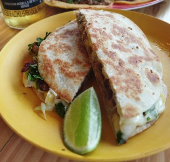 Carne de res, entre 2 tortillas de harina con queso derretido, adicionado con cebolla y cilantro.