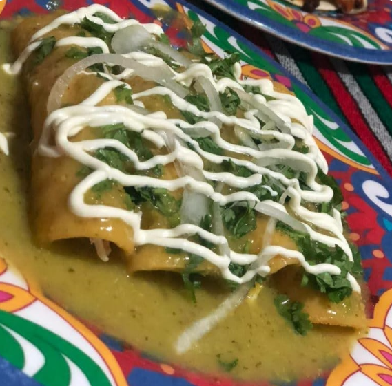 4 Tortillas de maíz, rellenas de carne al pastor (cerdo) bañadas con la salsa de la casa, crema, cebolla y un toque de cilantro.