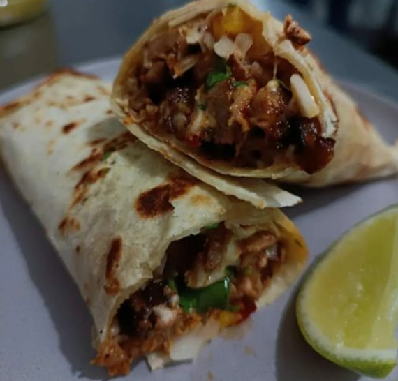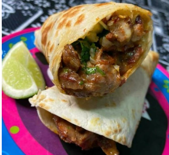 Carne de cerdo con queso derretido, envuelta en una tortilla de harina grande, con un toque de guacamole, acompañado de cebolla, cilantro.