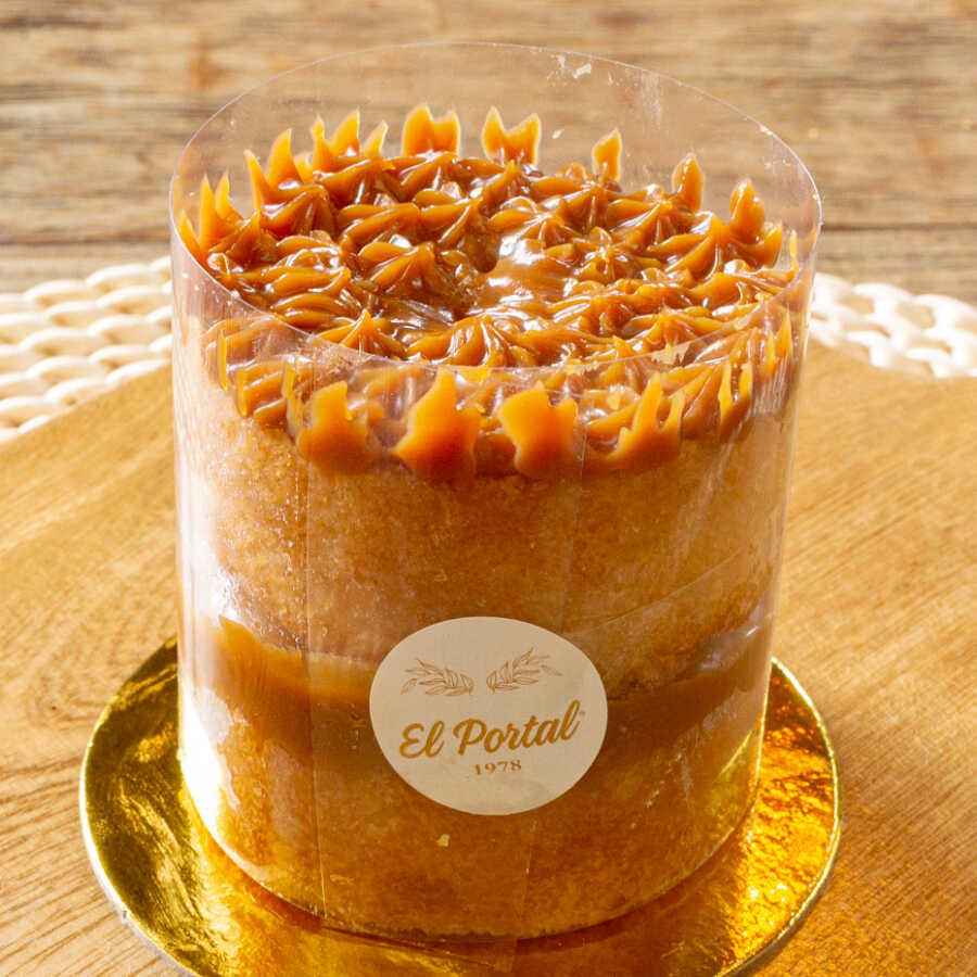 Clásica torta casera de textura esponjosa de 2 capas entreteladas con arequipe, decorada con una capa de arequipe por encima. receta tradicional para el día a día. 1-2 porciones.