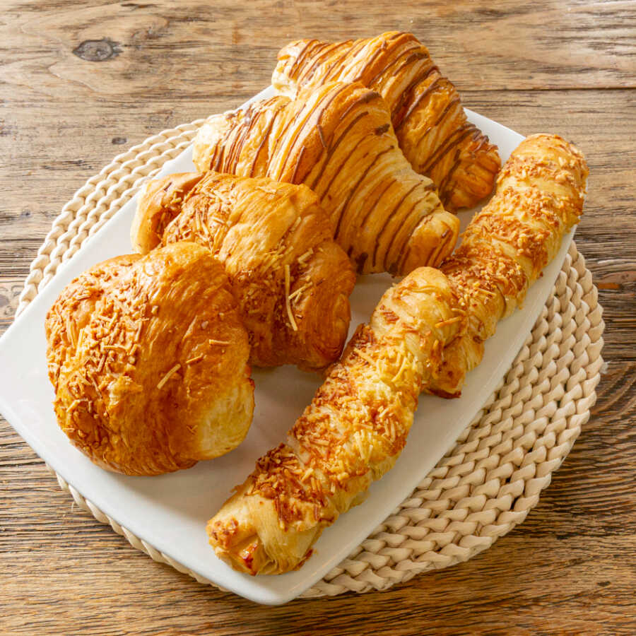Producto elaborado a partir de mantequilla 100 natural, relleno de queso mozzarella, campesino, cheddar.