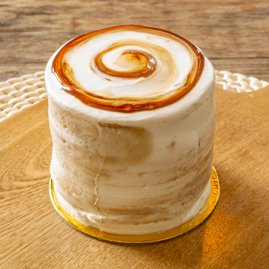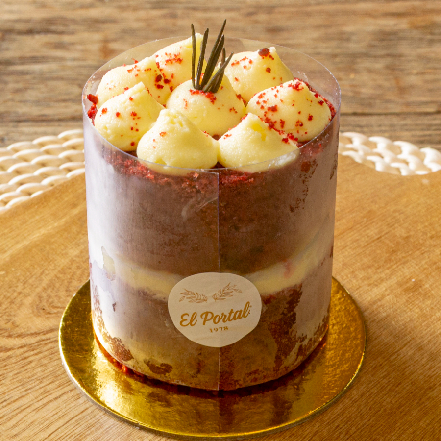Bizcocho red velvet con sabor a vainilla y un toque de cocoa que se caracteriza por su color rojo-marrón. 3 capas de bizcocho entreteladas con crema de queso ligeramente cítrica para realzar su sabor, decorado con picos de crema de queso alrededor. 1-2 porciones