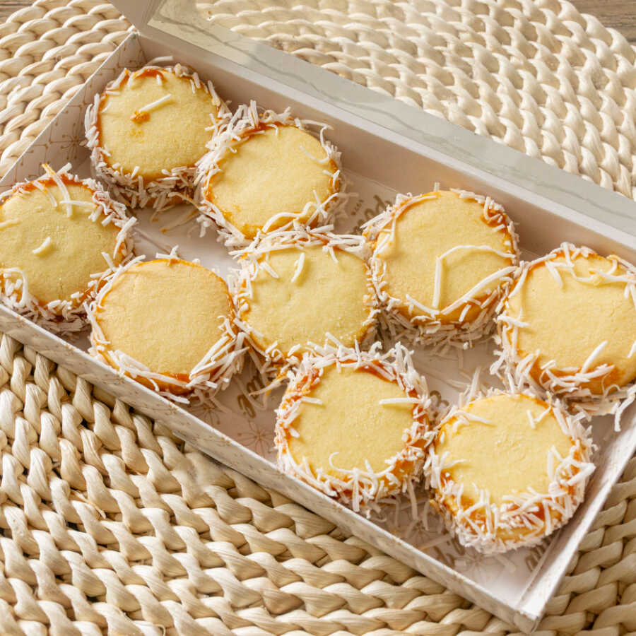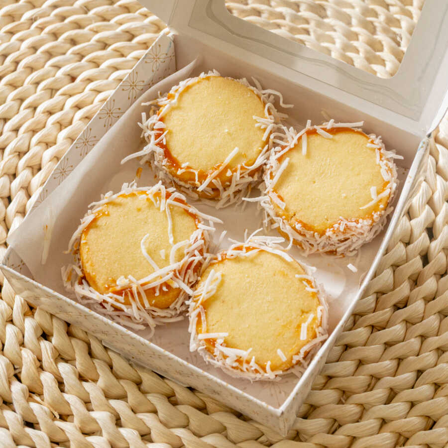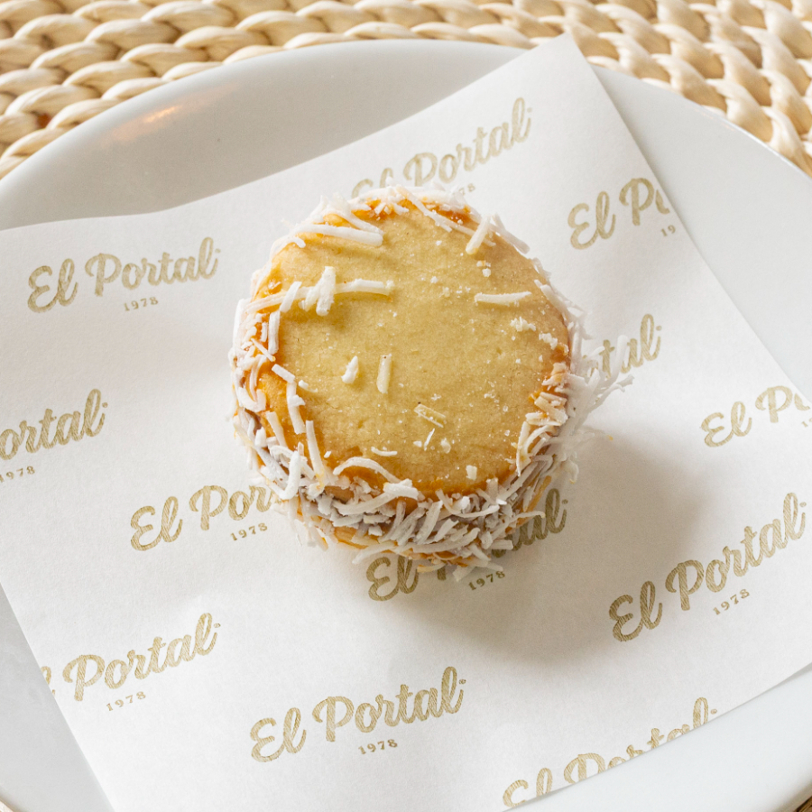 Alfajor relleno de arequipe y coco rallado.