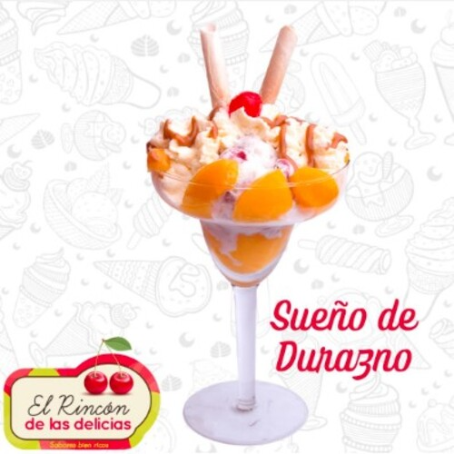 Dos sabores de helado acompañados de duraznos, Salsa de arequipe, barquillos, cereza y chantilly.