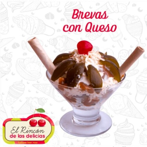 Brevas, queso, salsa, barquillos, cereza y chantilly.