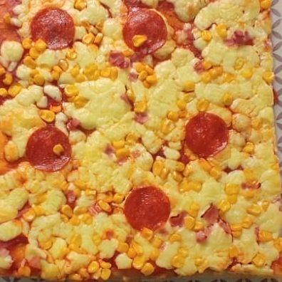 Porción 10cm×15cm de base de masa de pan, fina y rectangular, recubierta con salsa de tomate, queso mozzarella, jamón y maíz dulce.