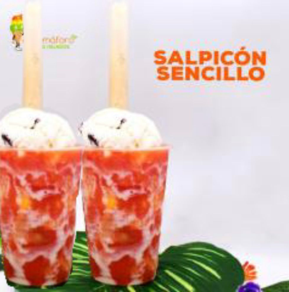 Un sabor de helado, mezcla de salpicón, un sabor de salsa y barquillo.
