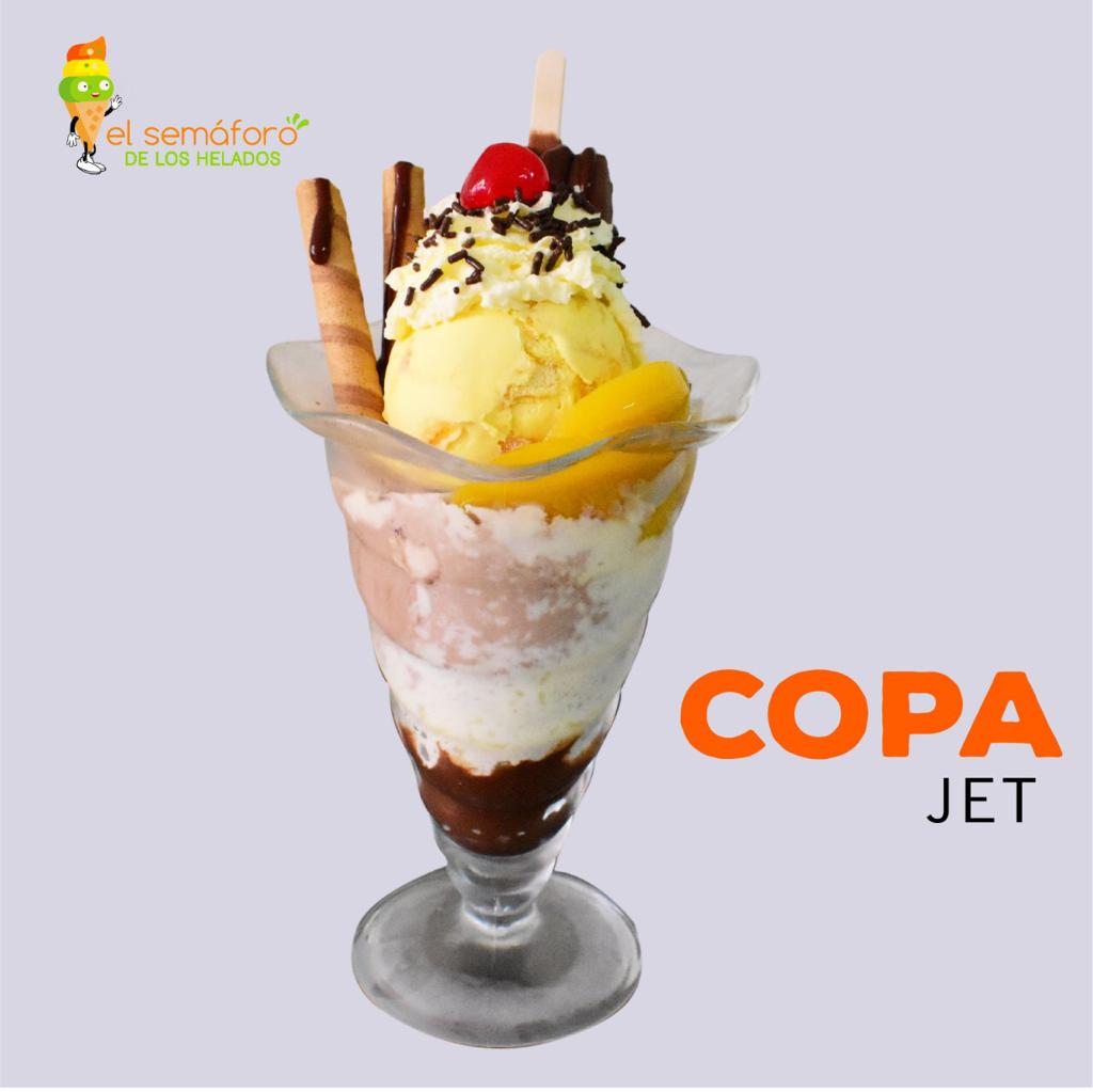 Dos sabores de helado, duraznos, Chantilly, barquillo piazza, Cereza, lluvia de chocolate, salsa de chocolate y una paleta Jet tradicional o Jet cookies que cream.