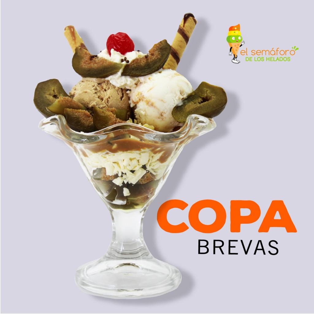 Dos sabores de helado, Brevas en almíbar, queso, Chantilly, Cereza, un sabor de salsa, lluvia de chocolate y barquillo piazza.