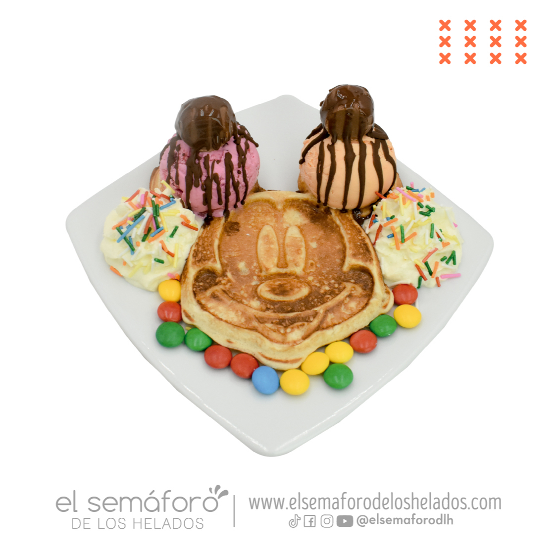 Dos sabores de helado, waffle de Mickey, chantilly, un sabor de salsa, m&m ́s, chocmelos y lluvia de colores.