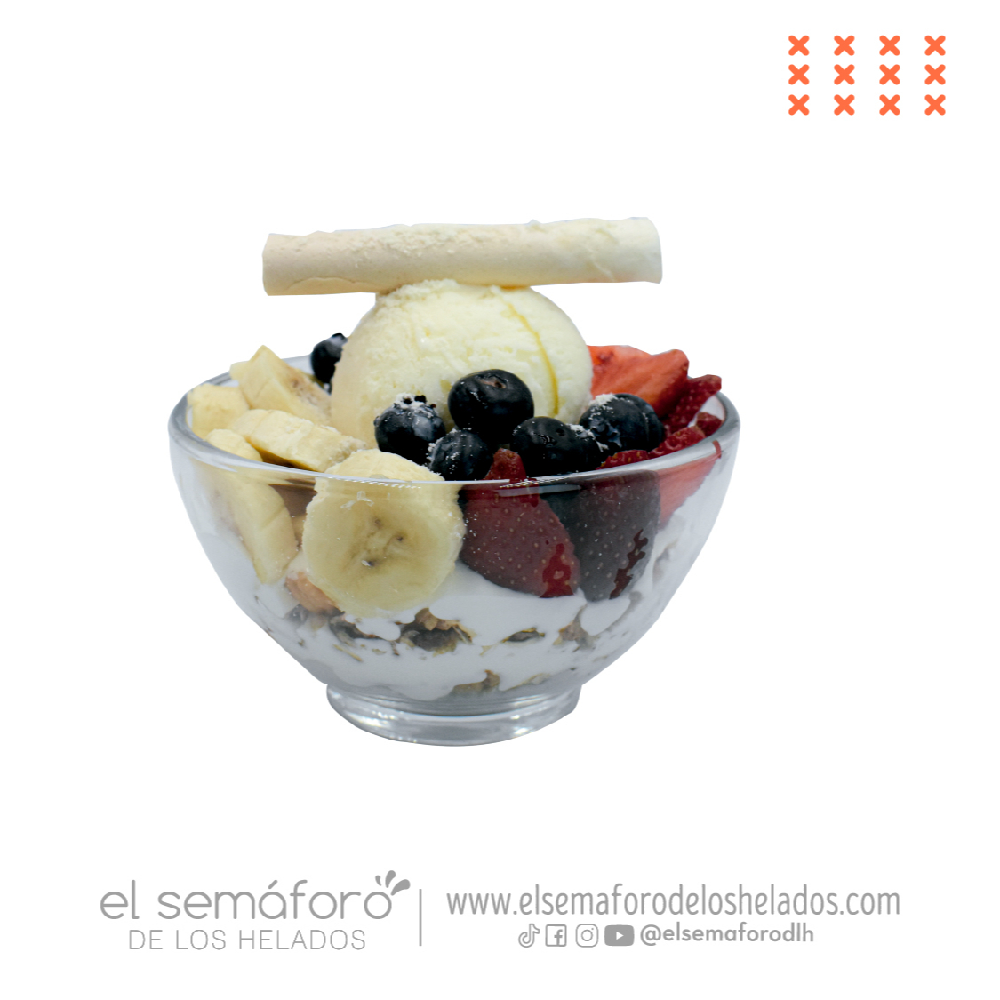 Helado de vainilla light, yogurt griego, granola, fresas, arándanos, banano, barquillo y un toque de proteína.