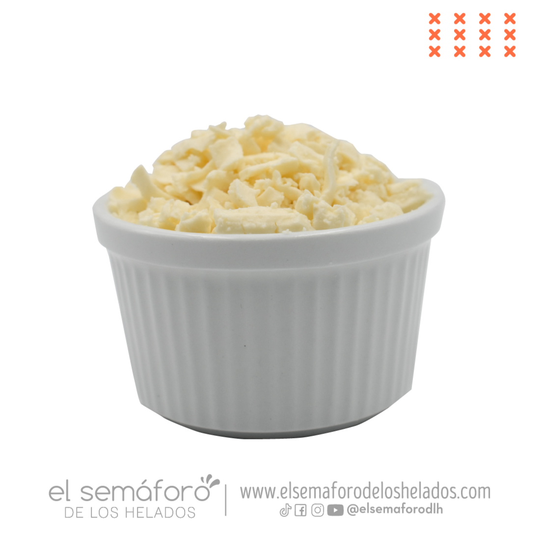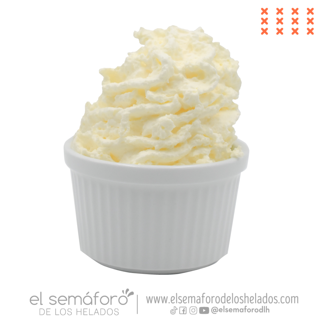 Queso, chantilly, fruta a elección (Fresa, durazno o banano), oblea, un sabor de salsa y lluvia de chocolate.