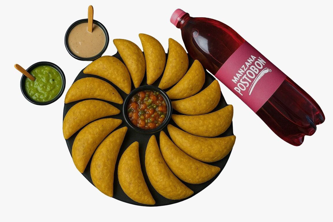 10 Empanadas más 5 pasteles más 5 papas más gratis gaseosa 2.5 L (sabor sujeto a disponibilidad).