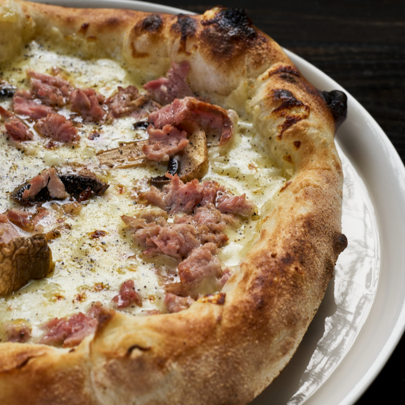 Mozzarella, champiñones, jamón artesanal ahumado, pimienta negra y aceite de oliva extra virgen.