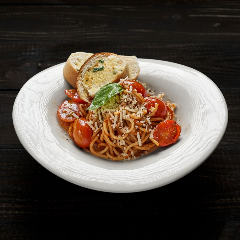 spaghetti 200gr con base de salsa napolitana, albahaca, tomate uvalina y queso parmesano, acompañado de pan de la casa.