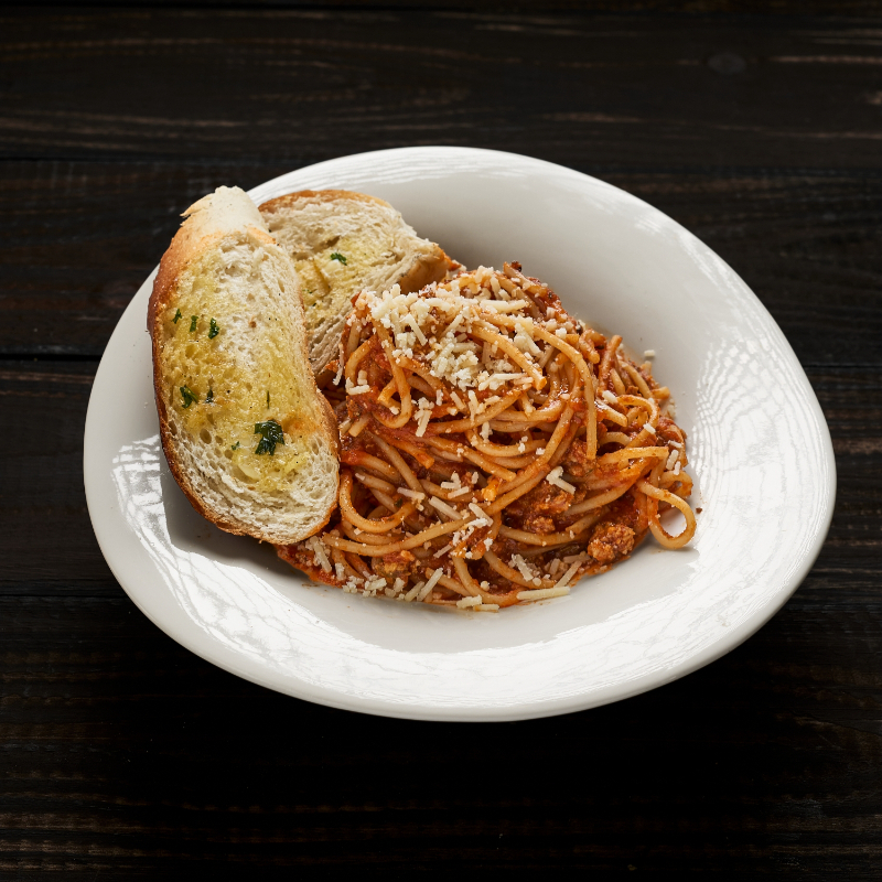 Spaghetti 200gr con base de salsa pomodoro, bolognesa y queso parmesano, acompañado de pan de la casa .