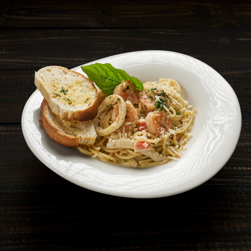 Spaghetti 200gr frutos del mar, camarones al ajillo, aros de calamar y palmito, acompañado pan de la casa.