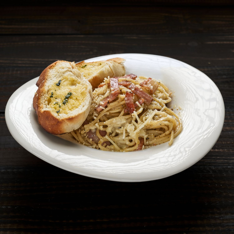 Spaghetti 200gr con base cremosa de huevo, pimienta negra, tocineta y queso parmesano, acompañado de pan de la casa.