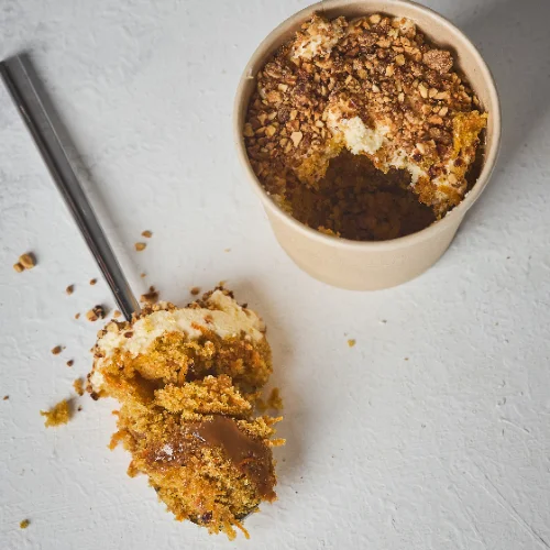 Cuchareable de torta de zanahoria, capas de bizcocho con toques de canela, arequipe cremoso, crema de queso y almendras crocantes. ¡Acompañado de cuchara comestible!