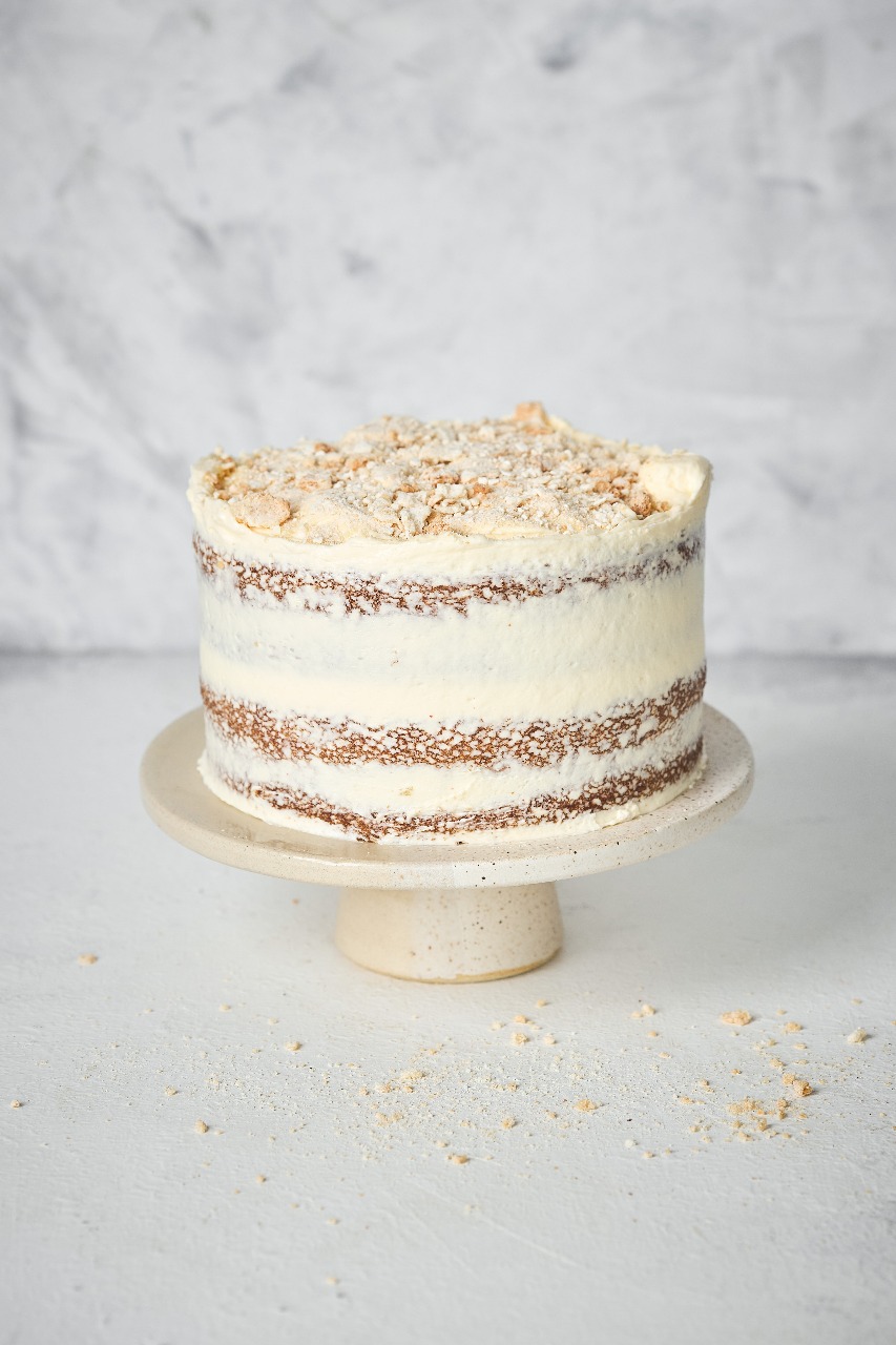 Bizcocho de vainilla, mermelada de mora, cobertura de queso crema y crocante de merengue. 8 a 12 porciones.