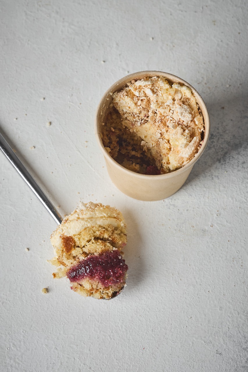 Cuchareable de torta de vainilla. capas de bizcocho de vainilla, mermelada de mora, crema de queso y crocante de merengue. ¡acompañado de cuchara comestible
