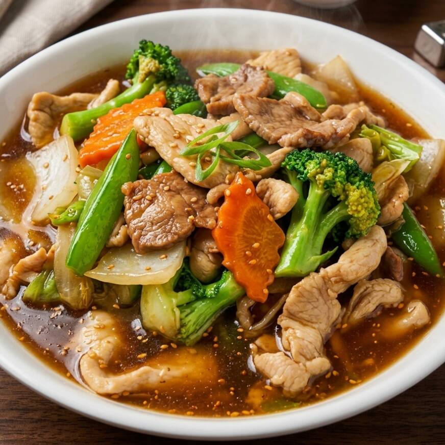 Vegetales Salteados con Pollo, Cerdo, Jamón y Camarones.