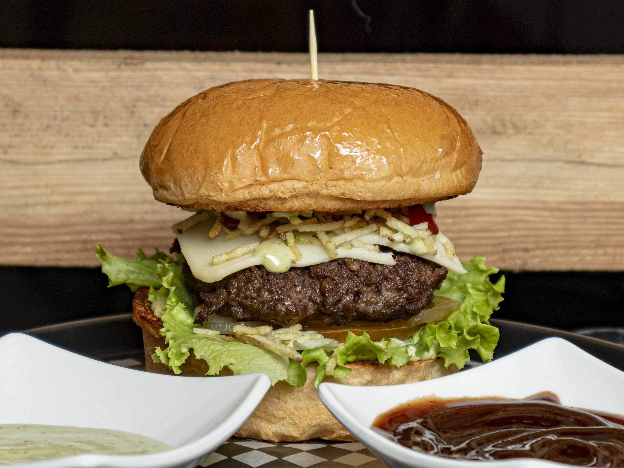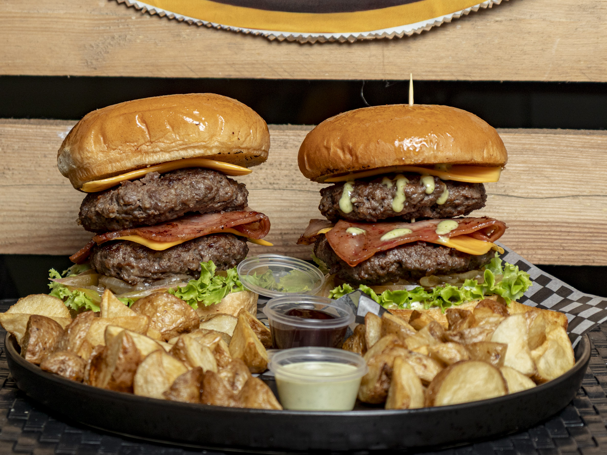 Pan brioche, carne de hamburguesa artesanal 125gr, chicharrón carnudo, queso cheddar, tocineta ahumada, sour cream, cebolla acaramelada, lechuga crespa, tomate, salsa y acompañadas con papas al casco