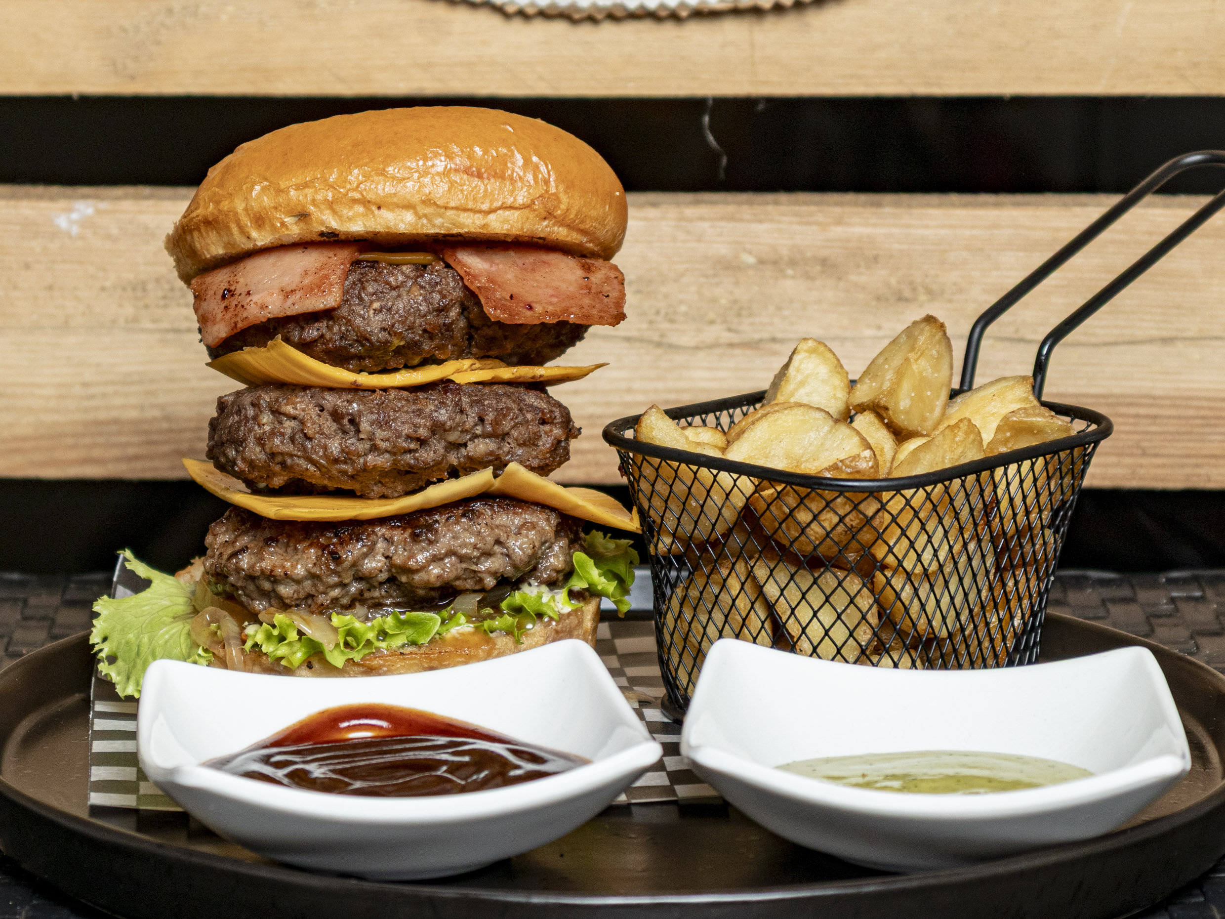 Pan brioche, triple carne artesanal, triple queso cheddar, tocineta, cebolla acaramelada, lechuga crespa, tomate y salsas.