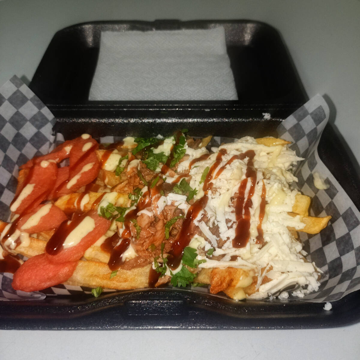 Papas a la francesas, cerdo despechado a la bbq, salchicha, queso costeño rallado y salsas.