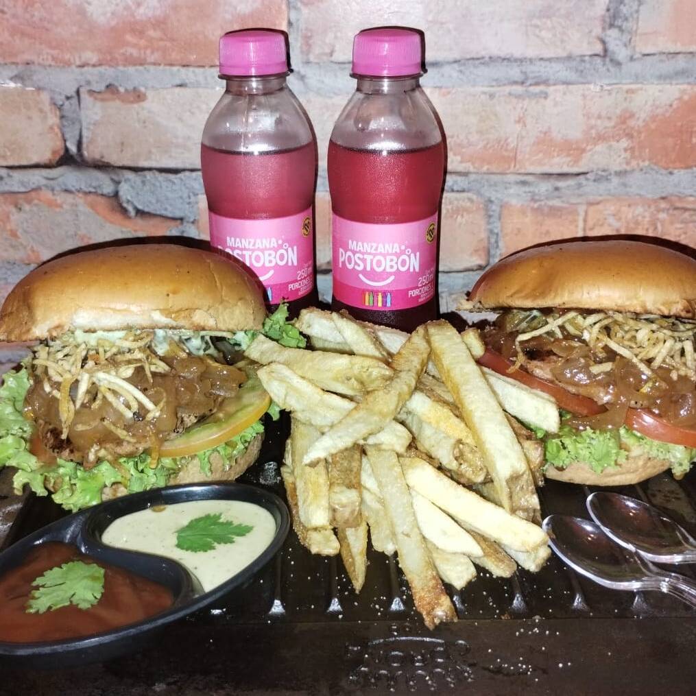 Pan brioche, carne de res artesanal, queso cheddar, tocineta ahumada, cebolla acaramelada, lechuga crespa, tomates, ripio y salsas. Acompañadas de papas a elección.