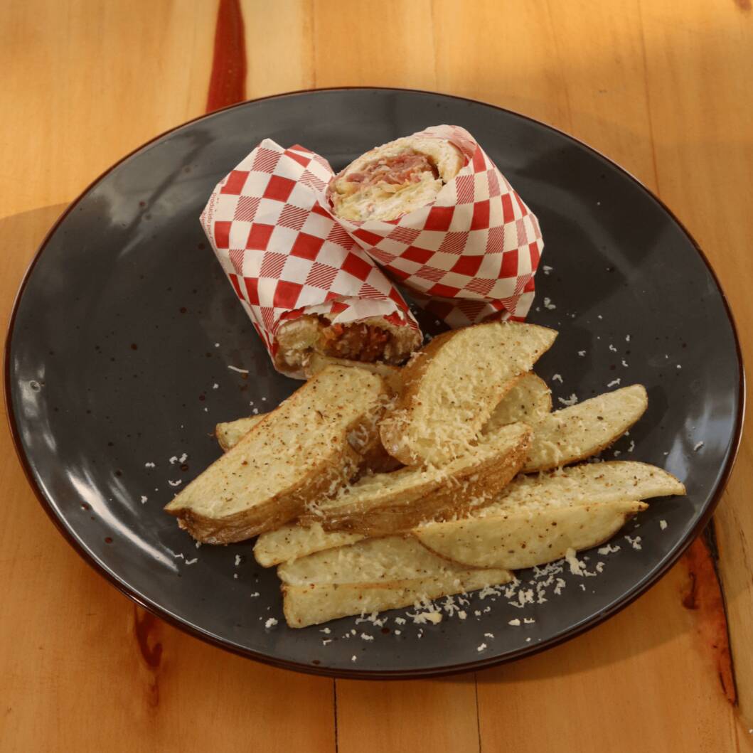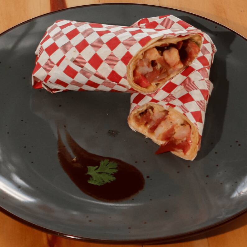 Wrap frío de pan fino con jamón y camarones, acompañado de encurtido y una salsa de la casa. Sabor fresco y potente.