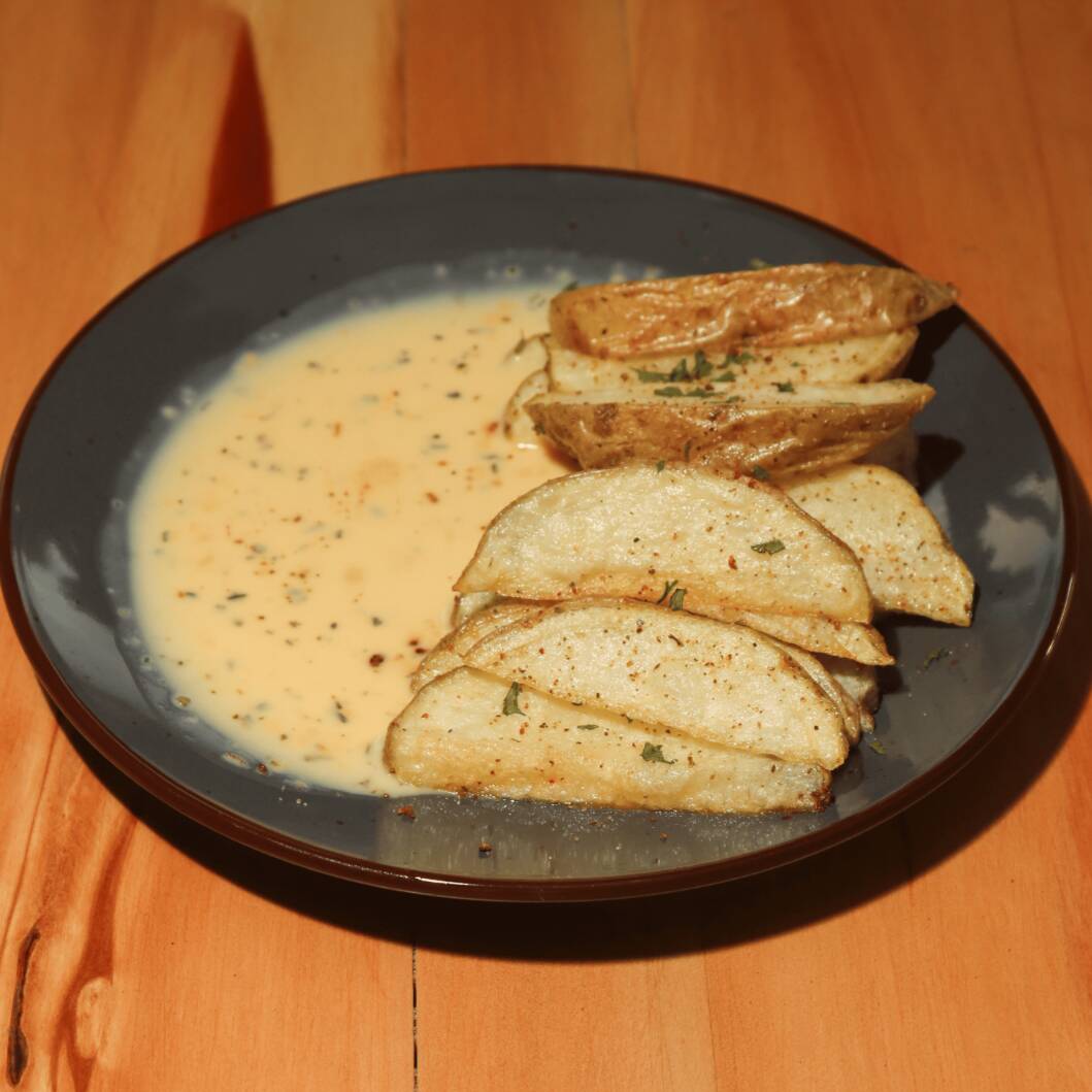 Papas rústicas horneadas con finas hierbas, acompañadas con salsa de queso de la casa